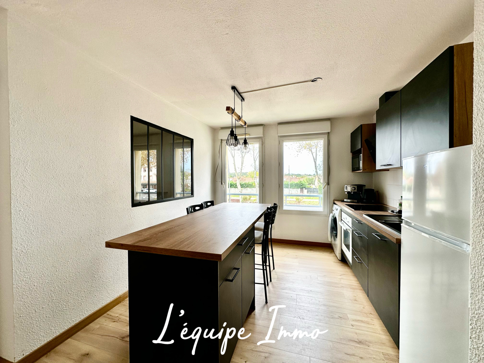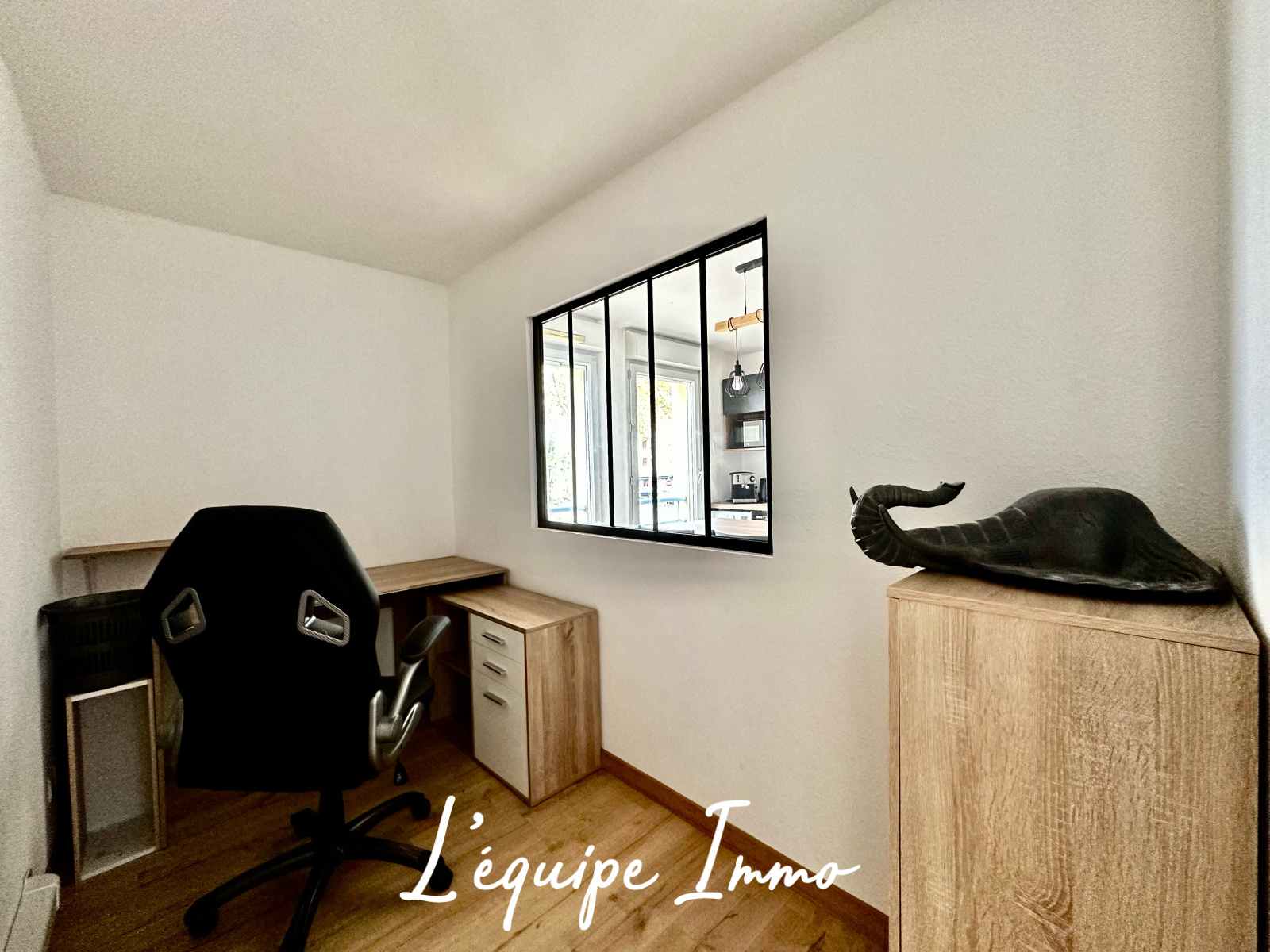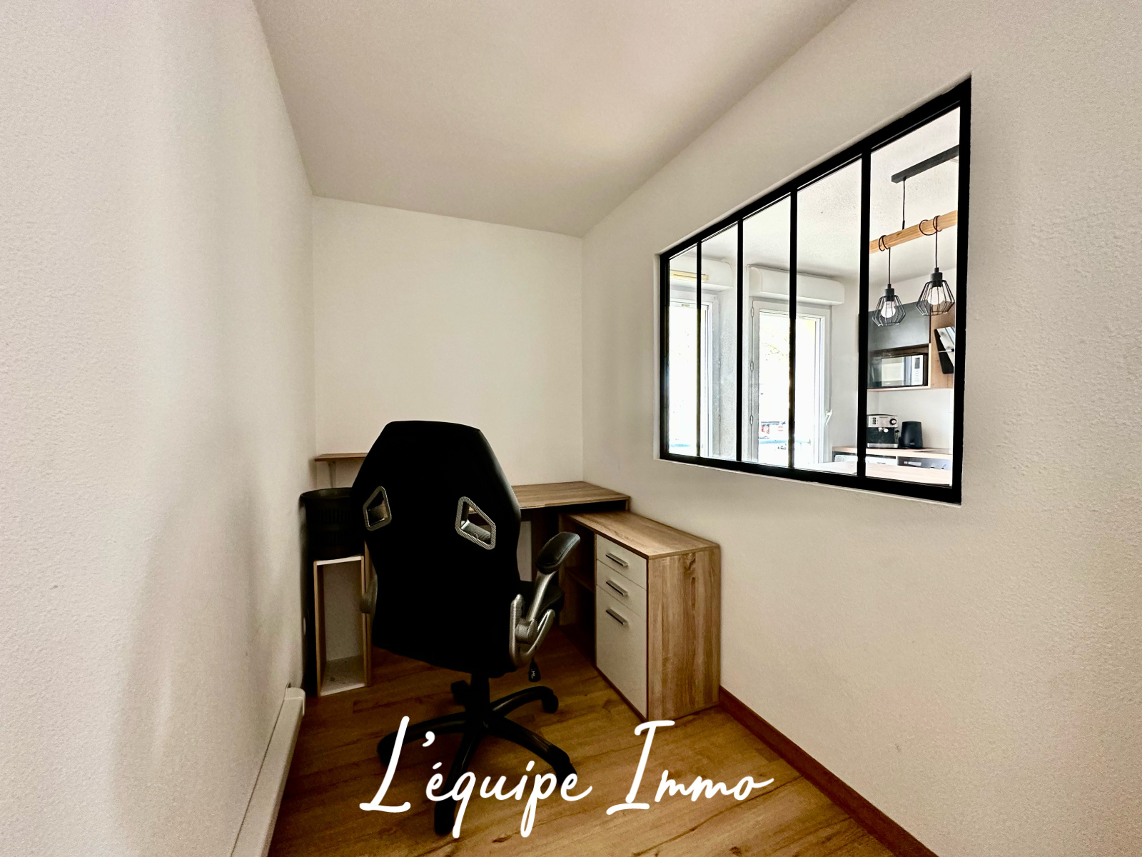 L’appartement se compose d’une pièce de vie lumineuse avec salon et cuisine entièrement équipée et spacieuse. Un espace bureau séparé par une verrière offre un cadre idéal pour le télétravail. La chambre dispose d’un placard intégré permettant un rangement optimal. Une salle de bain et des WC indépendants complètent l’ensemble.