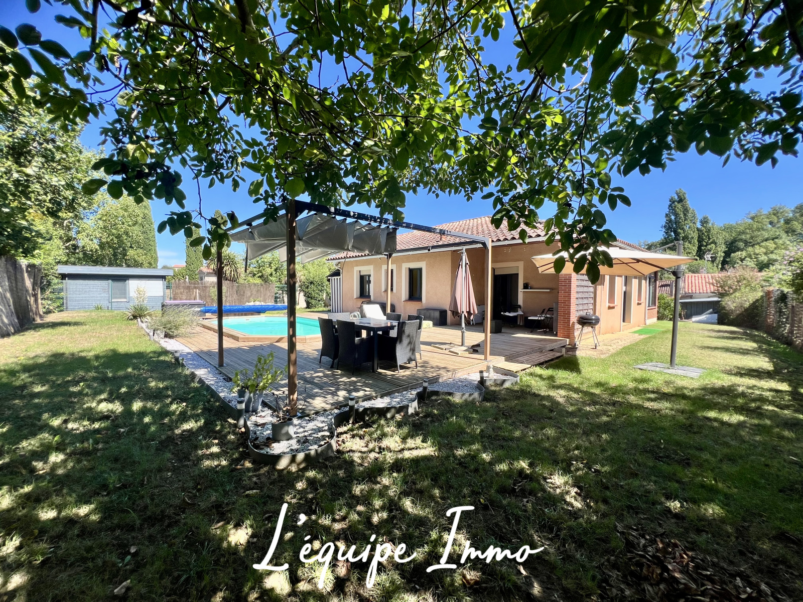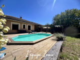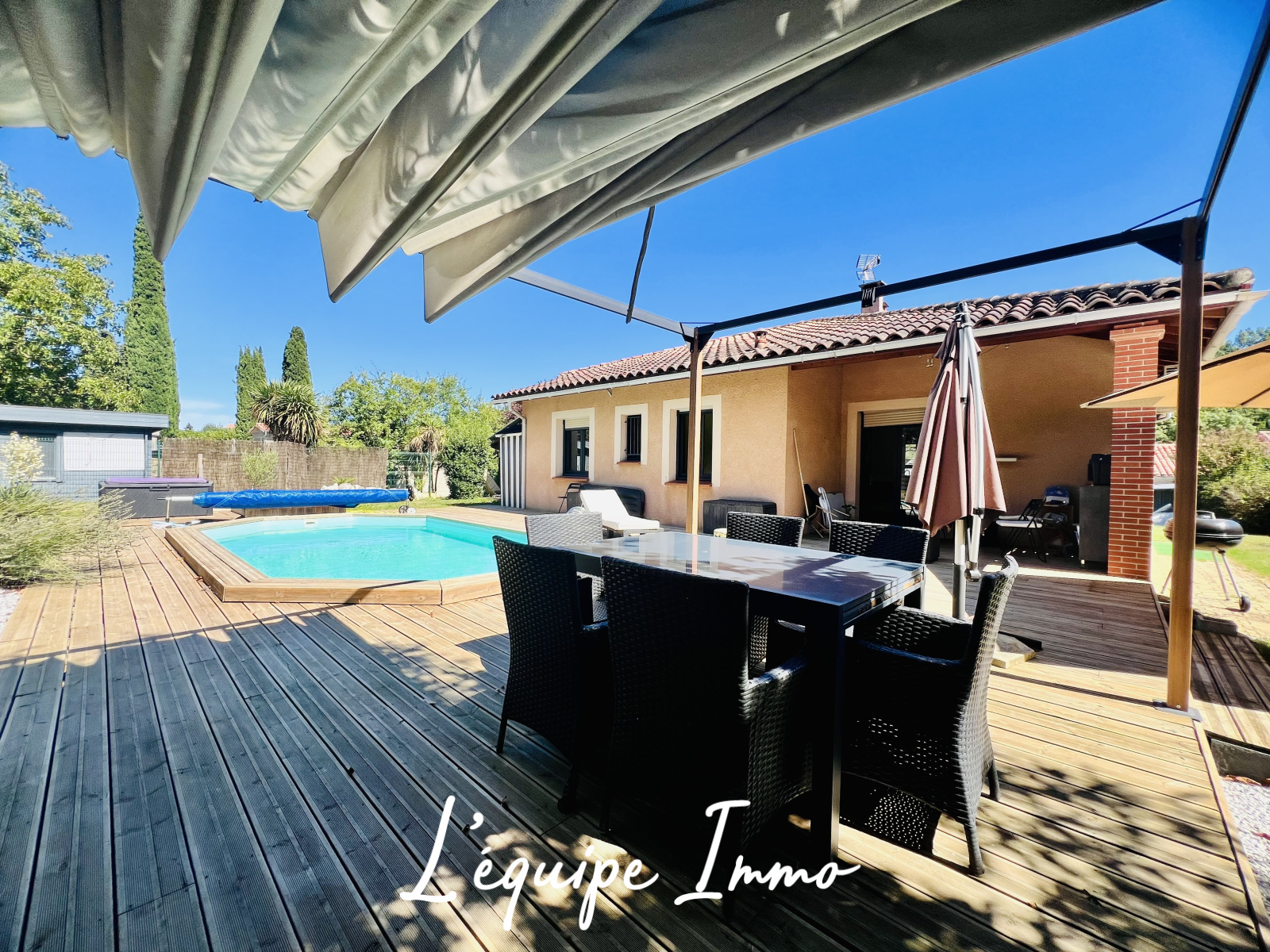 A l'extèrieur, le terrain clos et arboré accueille une agréable piscine et une spacieuse terrasse en bois, parfaites pour vos moments de détente et convivialité.