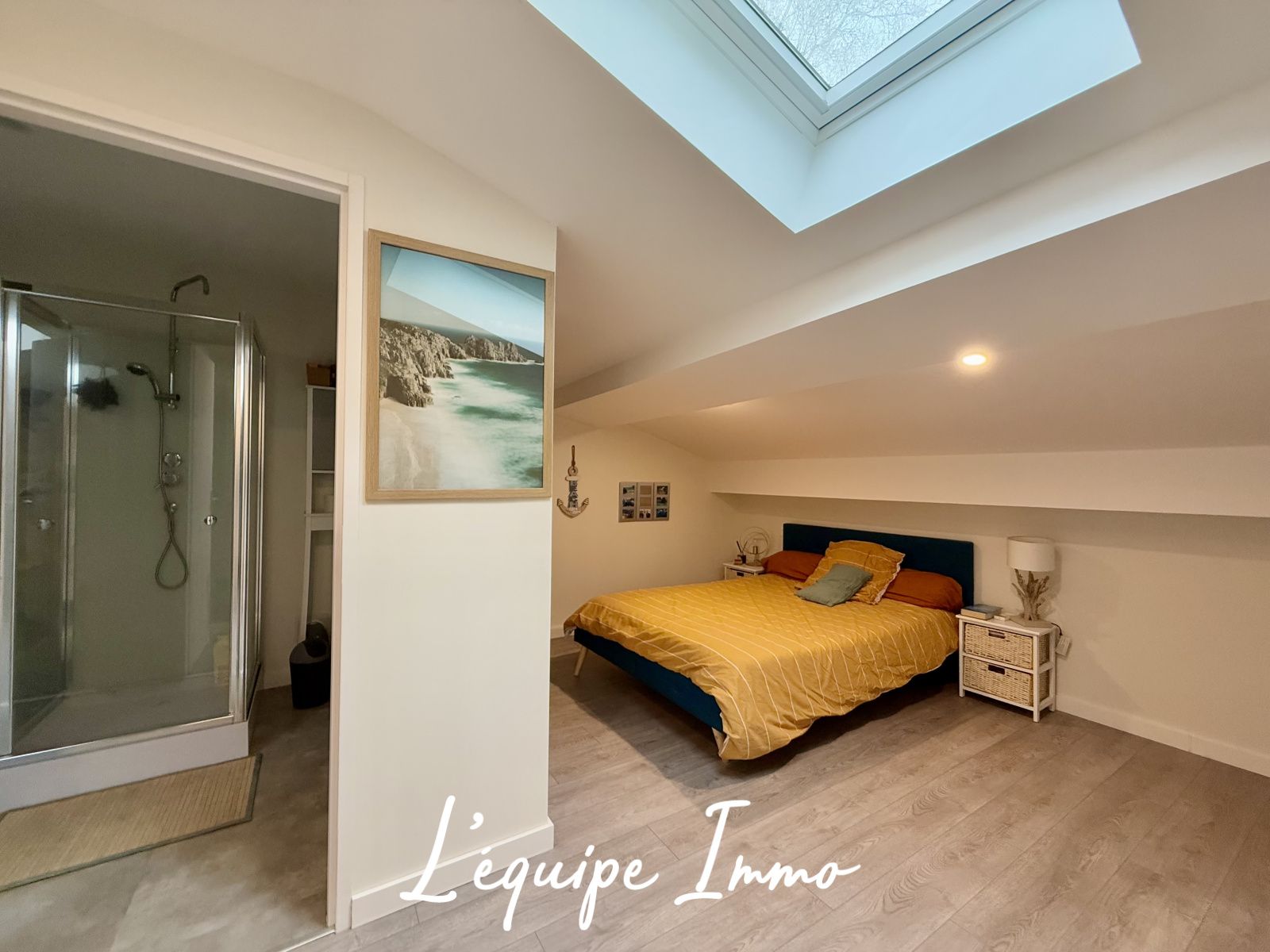 L'entrée avec placard s'ouvre sur une belle pièce de vie déplafonnée de 35m2 et sa cuisine ouverte avec cellier attenant. Une grande chambre parentale de 16m2 avec dressing, une salle d'eau et un WC indépendants complètent le niveau.