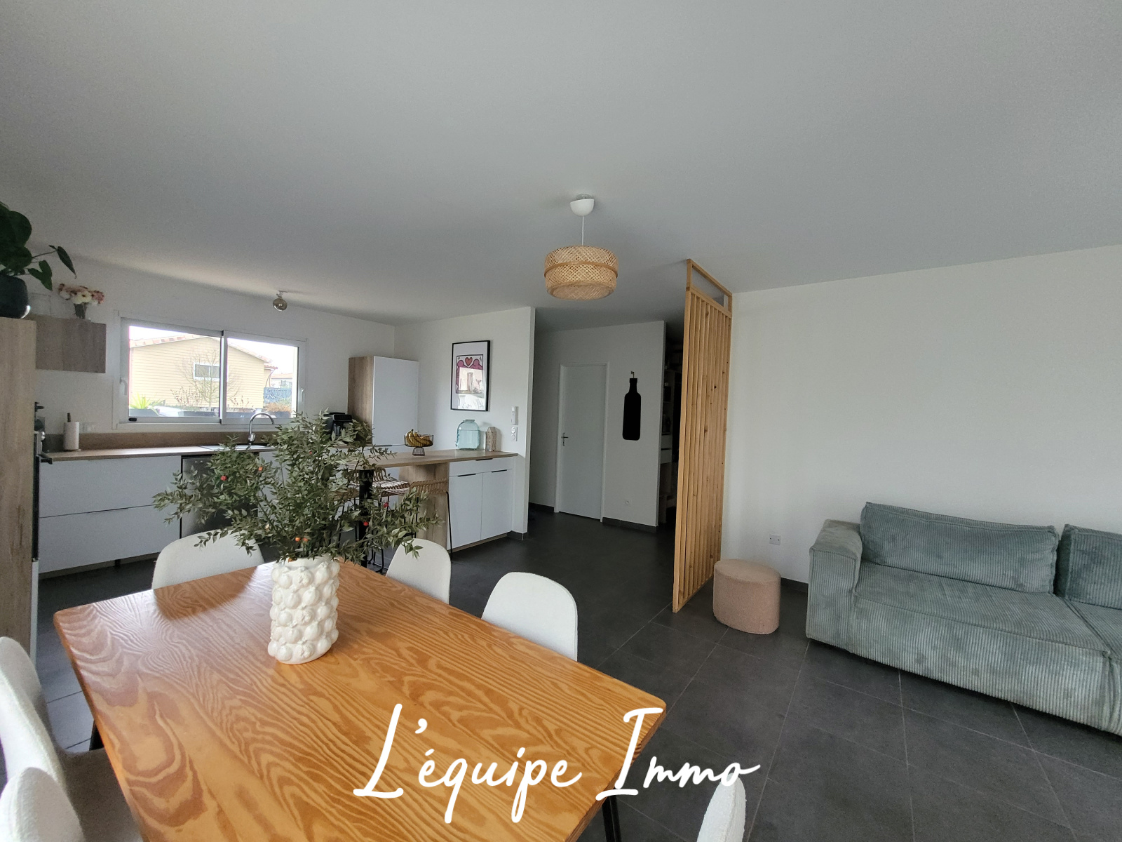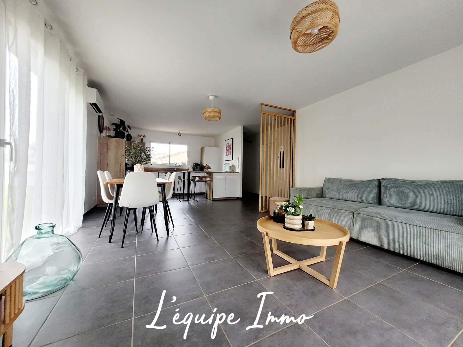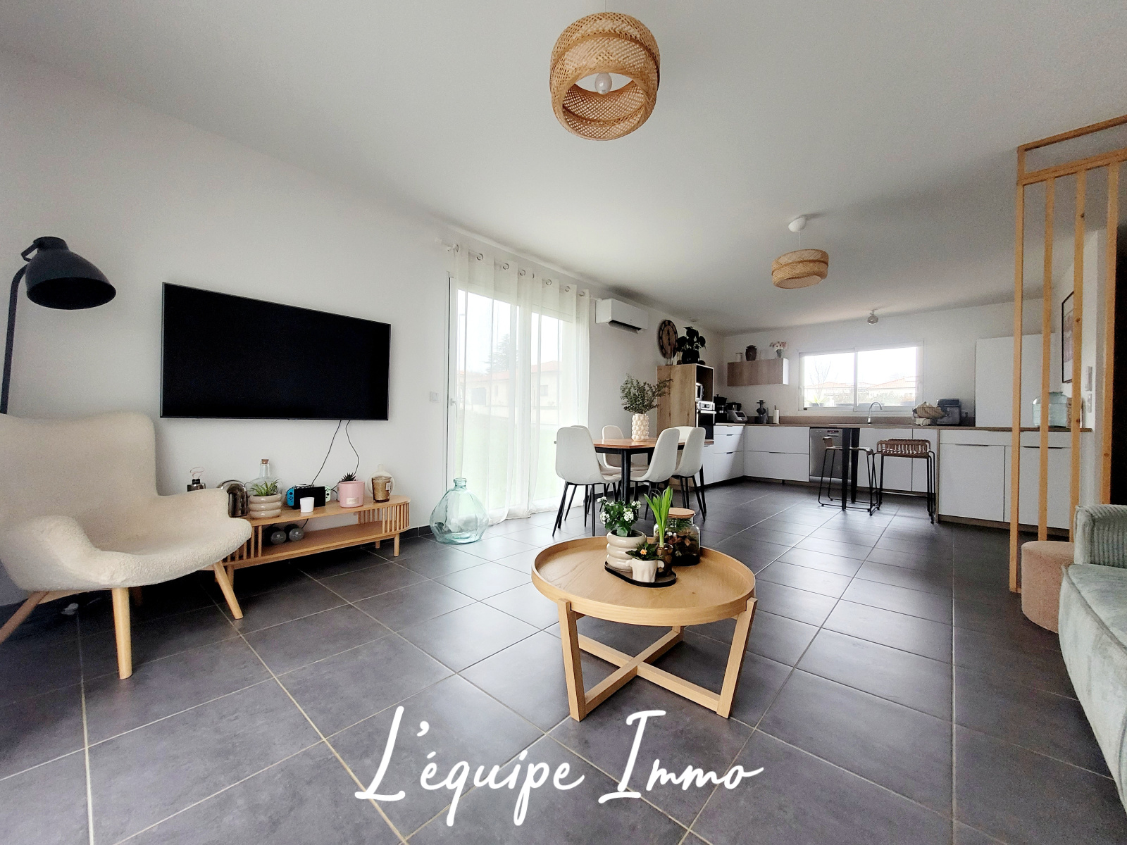 L'entrée s'ouvre sur la pièce de vie de plus de 42 m² lumineuse grâce à ses nombreuses ouvertures, et équipée de la climatisation réversible.