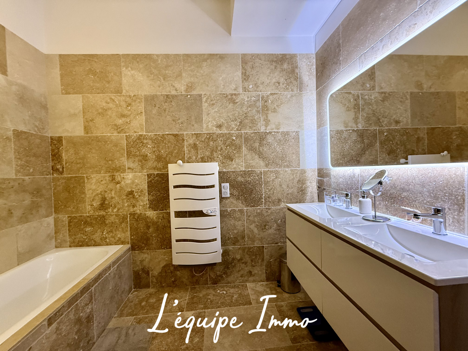 Le rez-de-chaussée accueille deux chambres confortables, une belle salle de bain en travertin ainsi qu’un petit espace buanderie pour le côté pratique.